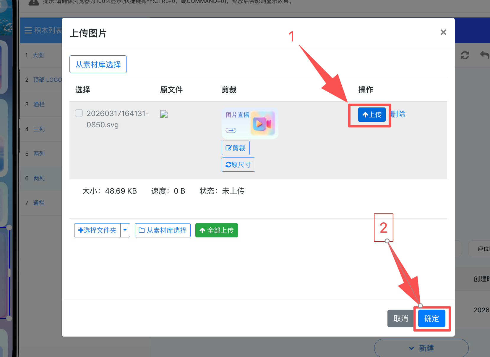 选中刚添加的积木,点击“重新上传”,选择第一步中保存的 SVG 文件,点击上传,如下图所示: